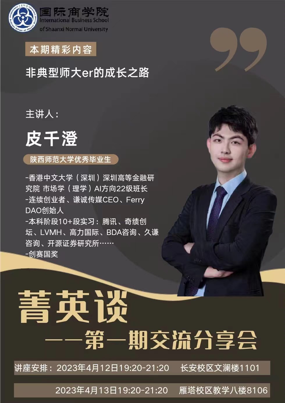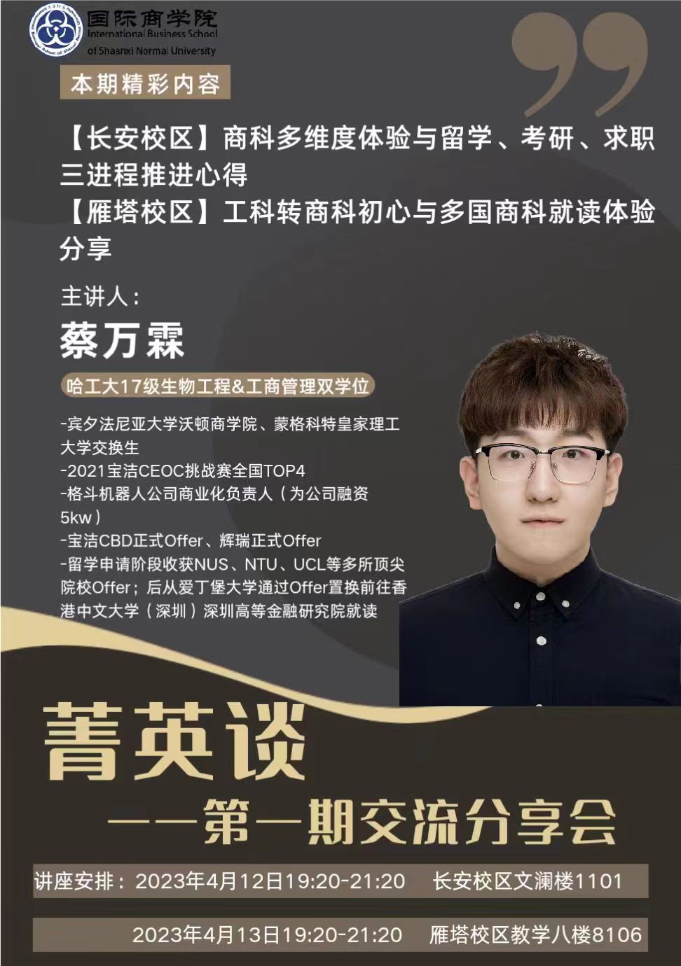 会上,皮千澄向同学们讲述了其参与科研竞赛项目、实地走访西安的VR企业、前往北上广VR企业的钻研打磨、与企业高管合伙人进行沟通交流等经历,重在告诉同学们要勇敢“跳出盒子”来思考,实现从“员工思维”向“职场思维”的转变。其次,蔡万霖先向同学们讲述了他从工科专业转为商科专业学习的心路历程,他告诉同学们“从核物理到生物工程,再到商科学习,一路以来我都在追寻自己的初心。跨专业的选择需要勇气,更需付出加倍努力。”随后,他分析了主流留学国家和小众留学国家的优劣势对比,为同学们出国留学申请提供了建议和指导,并根据自己参加宝洁CEO挑战赛的经历,建议同学们积极参加课堂以外的竞赛活动,在竞赛活动中提升自己的核心竞争力。