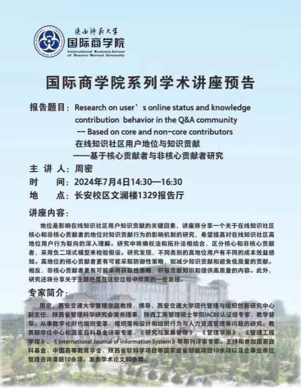 学术讲座预告——在线知识社区用户地位与知识贡献——基于核心贡献者与非核心贡献者研究
