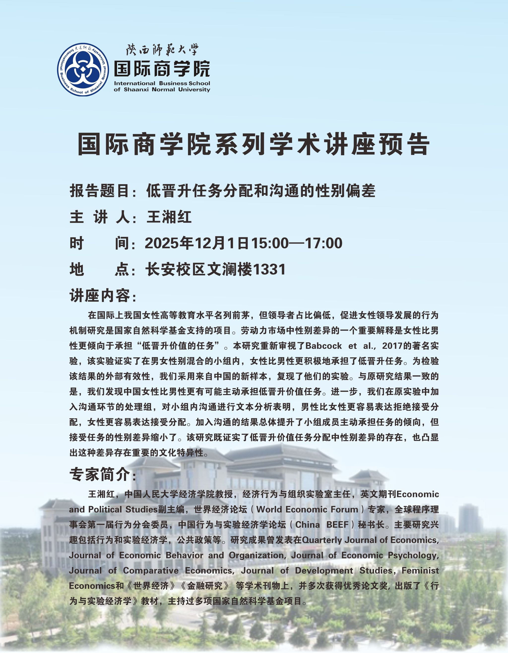 学术讲座预告——低晋升任务分配和沟通的性别偏差