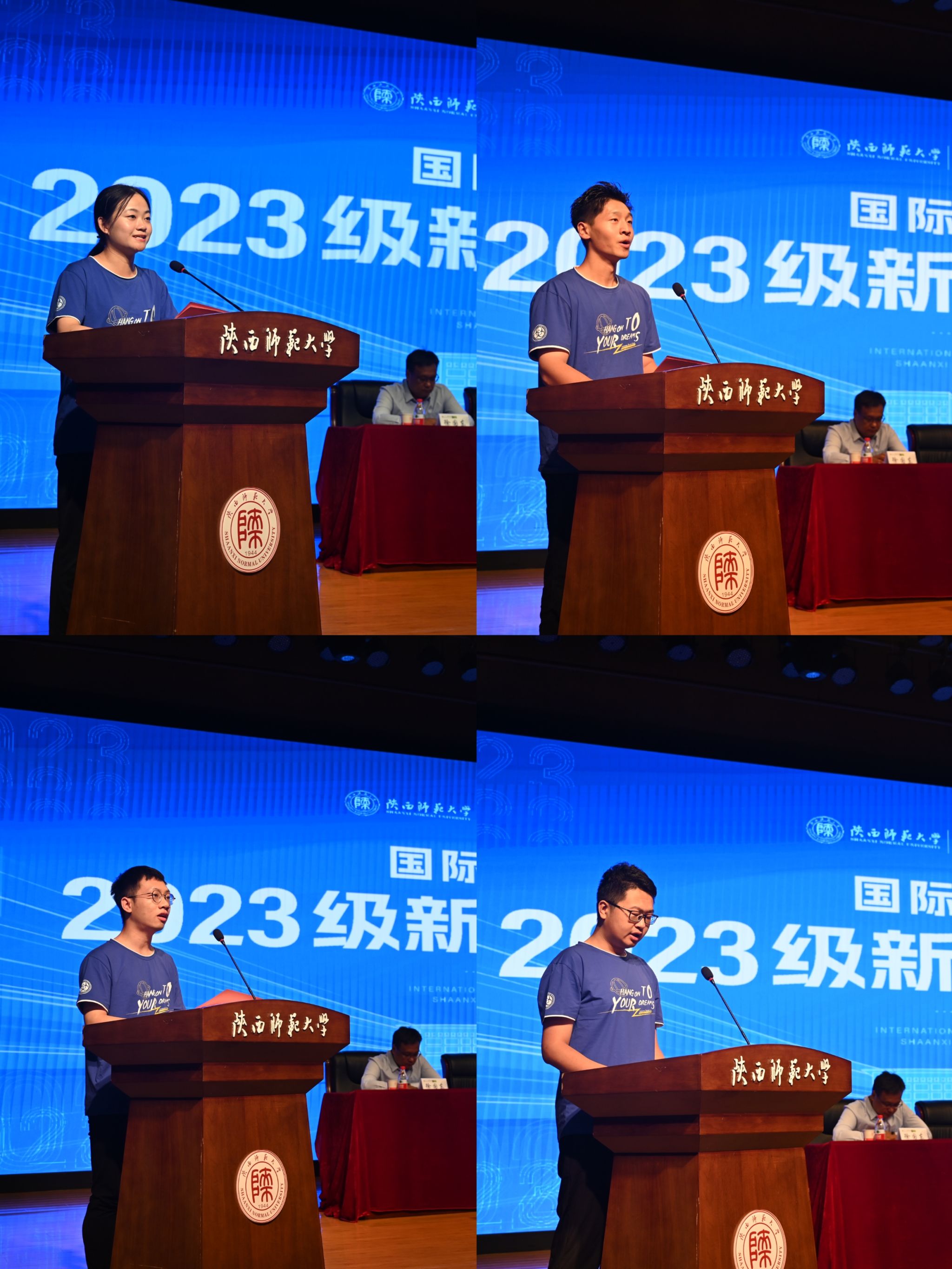 接着,在校生代表和新生代表依次发言。本科在校生代表、2020级经济学专业田鑫妮讲到:“迈过层层坎坷,随着目标的驱动,圆梦师大,愿同学们珍惜美好的校园时光,积极探索校园生活,制定规划,明确目标,以豁达乐观的心态面对即将展开的老员工活。在校研究生代表、2021级会计专硕黄锐与同学们分享了自己的科研经历,他希望同学们珍视课堂学习,积极参加学术活动,在竞赛中总结经验、提升自我,并寄语同学们在攀登知识高峰中追求卓越,在实践奋斗中谱写青春之歌。