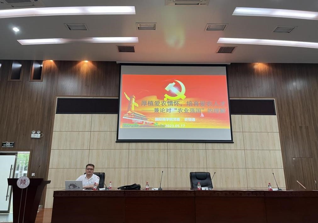 为深入学习贯彻习近平新时代中国特色社会主义思想主题教育,贯彻落实党的二十大精神,5月17日下午,副经理、党委委员史恒通在文澜楼B段报告厅组织开展了“厚植爱农情怀,培育爱农人才——兼论对‘农业强国’的理解”主题党课学习,组织管理系党支部、工商管理研究生第一党支部、会计专硕第一党支部、理论经济学研究生第三党支部、应用经济学研究生第三党支部全体党员参加了党课学习。