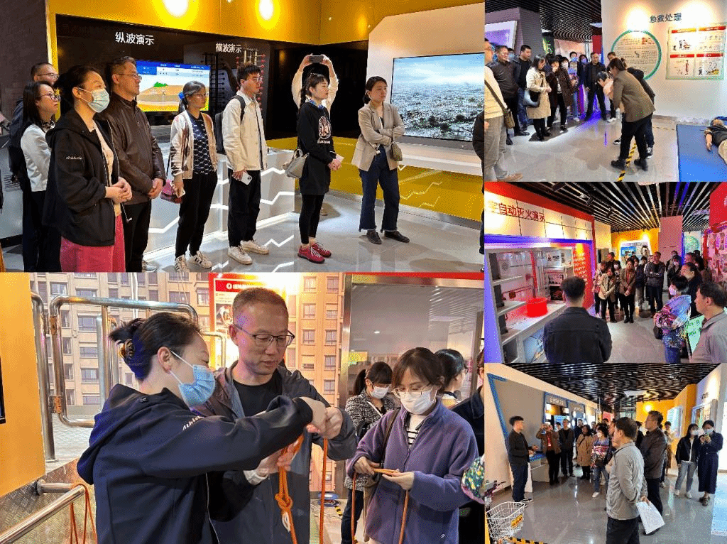在体验馆讲解员的带领下,党员干部依次参观了自然灾害、校园安全、消防安全、卫生健康、交通安全等五个展区,并亲身体验了地震震感、火场烟雾逃生等互动感应装置,学习了各种防灾避险常识、急救处理、救援绳打结、灭火器使用等安全措施。