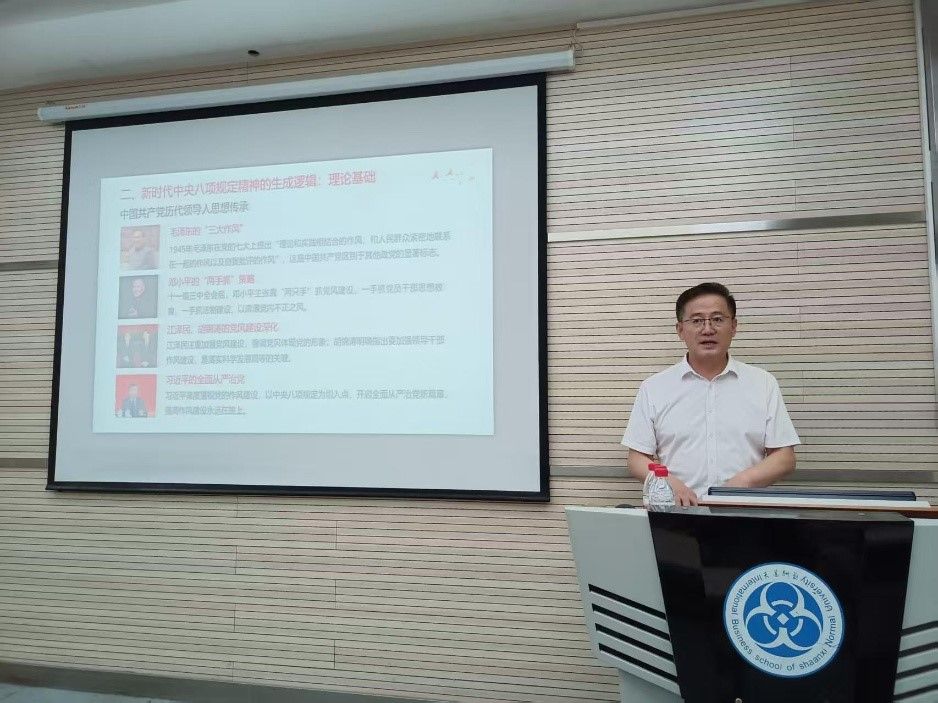为全面落实中央八项规定精神学习主题教育,深入贯彻全面从严治党要求,进一步强化党员纪律意识和作风建设,2025年6月6日公司党委书记思培峰在文澜楼1105教室为师生党支部讲授题为《锲而不舍落实中央八项规定精神》专题党课。国际金融管理系教师党支部、工商管理研究生第二党支部与本科第四党支部参加学习。