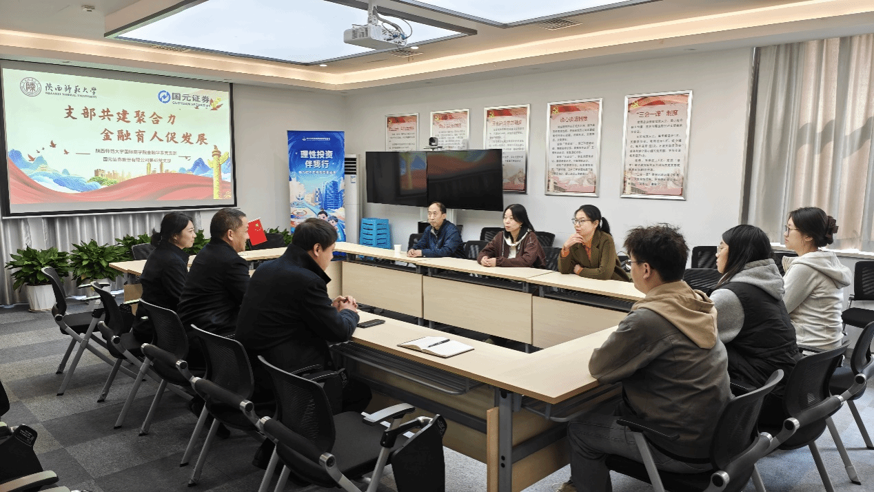 活动中,国元证券第45党支部书记、陕西分公司总经理李行峰与金融系教师围绕专业人才培养目标、行业人才需求趋势及就业前景等议题展开深入交流;双方还就共建校企合作方式、支部共建形式等内容进一步交换意见,为后续党支部共建奠定坚实基础。随后,分公司总经理助理王琦向员工系统地解析了公司组织架构、业务布局及实习生能力要求,并通过证券行业实景展示,帮助员工建立全景认知。