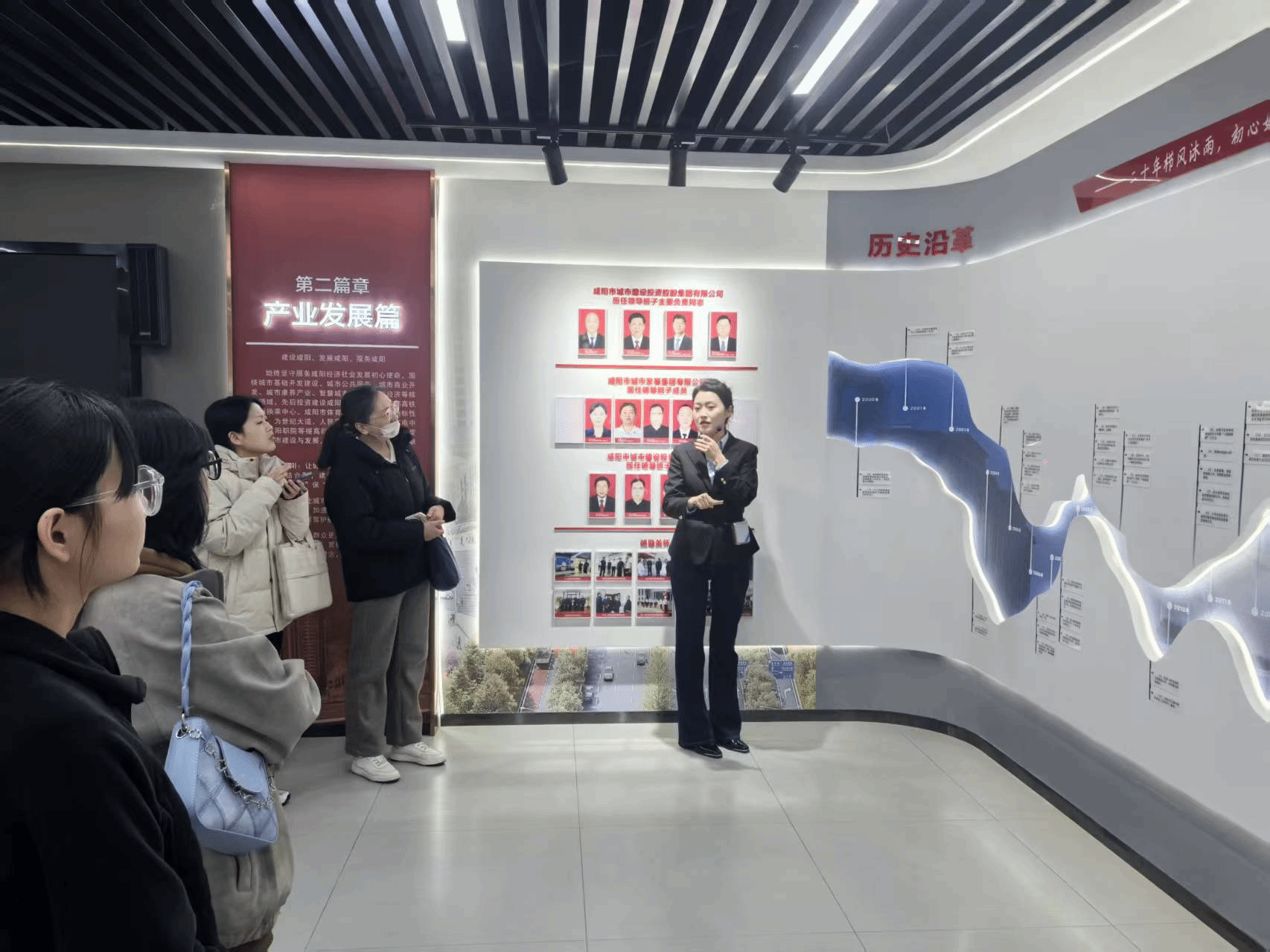 随后,师生们走进咸阳城发集团综合展厅,在企业发展历程、业务布局、重点项目等展区驻足聆听。从西安—咸阳一体化基础设施建设到新兴产业培育,从国有资产盘活到民生服务升级,一张张图片、一组组数据、一个个模型全面展现了集团作为市属重点国企,在深化国资国企改革、优化国有经济布局中的生动实践。特别是集团通过整合特许经营权、推进智慧化转型实现“老资产”焕发“新增量”的发展案例,让同学们深刻理解了全会提出的“做强做优做大国有企业和国有资本”的战略意义。