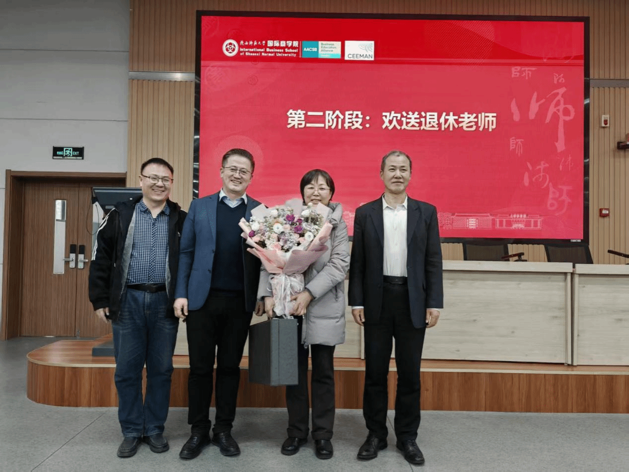 会议第二阶段,公司全体教职工欢送了2025年荣休教师,王琴梅老师发表了荣休感言。经济学系教师代表姚宇为荣休老师献花,雷宏振经理和思培峰书记为退休老师赠送纪念品。