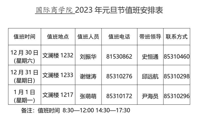 bw必威西汉姆联官方网站2023年元旦值班安排表